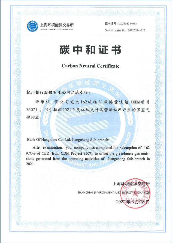 碳中和证书的取得,不仅标志着我行在碳中和方面做出的努力得到了权威第三方机构的认可与肯定,也标志着在浙江省和杭州市各级政府出台做好碳达峰碳中和工作实施意见的背景下,我行在推进多领域多层级多样化低(零)碳试点上迈出了重要一步。