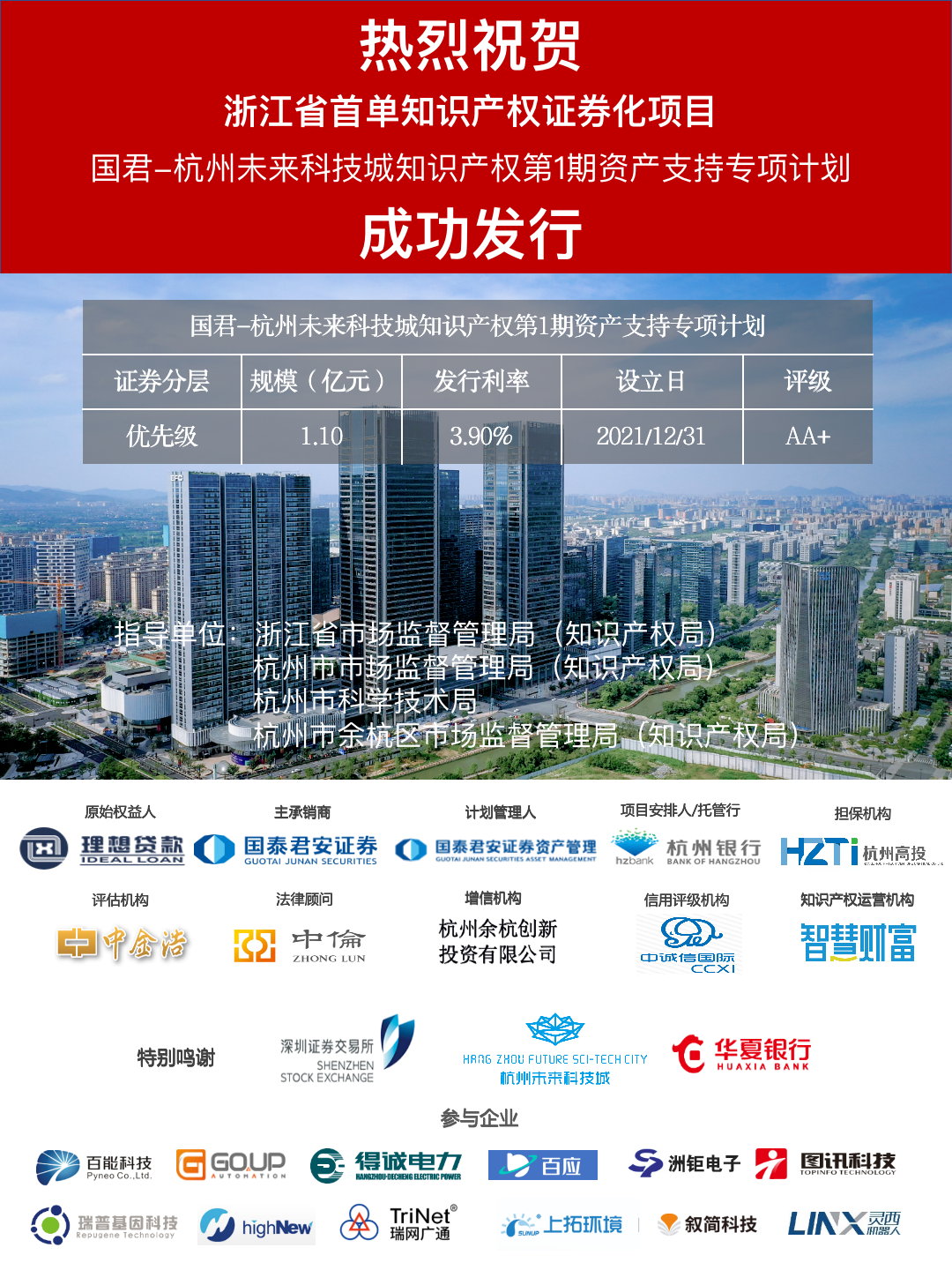2021年12月31日,杭州银行科技支行作为项目安排人的“国君-未来科技城知识产权第1期资产支持专项计划”设立,标志着浙江省首单知识产权证券化项目成功发行。本次项目科技支行还作为托管行并提供过桥资金支持,在多方金融机构共同努力下,实现浙江知识产权证券化项目零的突破,将“知产”变“资产”,为中小型科创企业在发展的道路上添加了新助力。