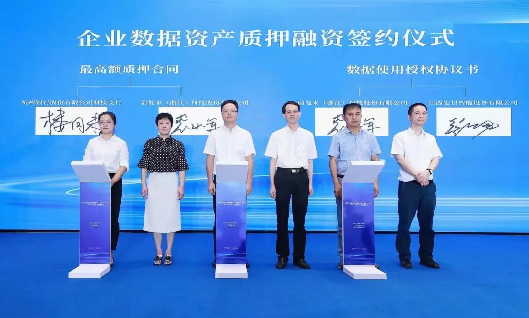 会上,蔚复来(浙江)科技股份有限公司和浙江凡聚科技有限公司与浙江省知识产权研究与服务中心进行了全国首单区块链的数据资产质押贷款协议现场签约仪式。其中,蔚复来将垃圾分类运营活动产生的环保测评数据,存至区块链存证平台,杭州银行科技支行依托于通过数据资产质押形式,给予企业500万授信额度。