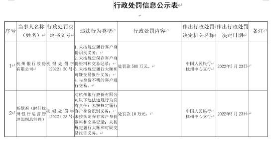 另外,时任杭州银行运营管理部副总经理杨慧莉,对该行“未按规定履行客户身份识别义务;未按规定保存客户身份资料和交易记录;未按规定履行大额和可疑交易报告义务”的违法违规行为负有责任。被人民银行杭州中心支行罚款10万元。
