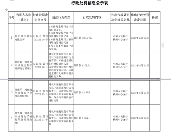 “ 5月31日,央行杭州中心支行公示一则行政处罚信息,杭州银行被罚580万元,3名相关责任人同时领罚。”