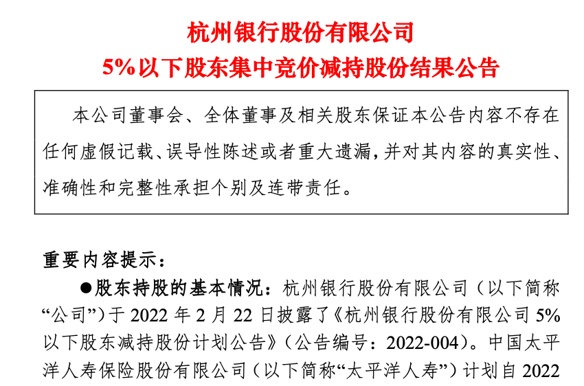 早在2月22日,杭州银行就披露,太平洋人寿计划自2月25日起的六个月内,通过集中竞价或大宗交易方式减持其所持公司股份,合计不超过 1.18亿股(含本数),即不超过公司普通股总股本的1.99%。