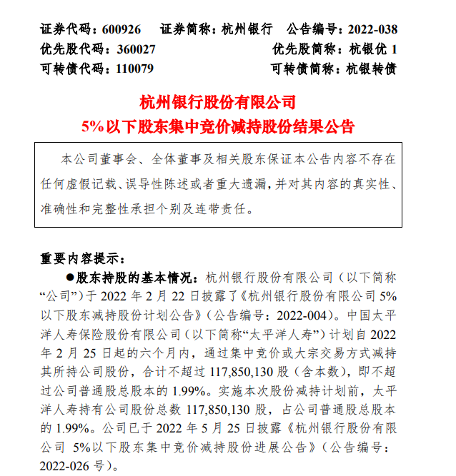 8月25日,杭州银行发布公告称,收到太平洋人寿发来的《关于减持杭州银行股份计划实施结果的告知函》。截至2022年8月24日,太平洋人寿本次减持计划的减持期限已届满,减持期间太平洋人寿通过集中竞价方式共减持公司股份117850130股,占公司普通股总股本的1.99%。