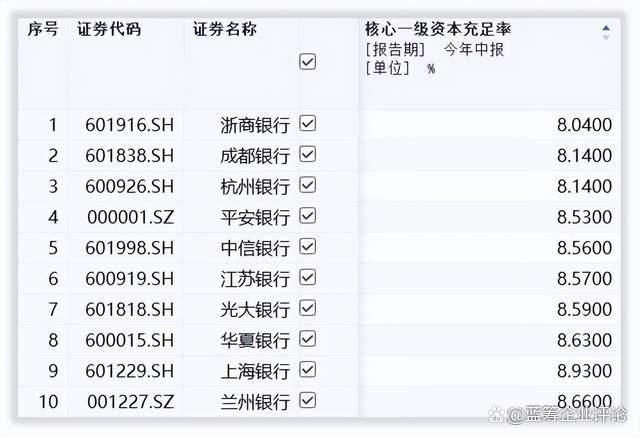 综合行业水平来看,今年上半年在42家上市银行中,杭州银行资本充足率位列倒数第十二名,一级资本充足率为行业倒数第五名,核心一级资本充足率8.14%,与成都银行并列倒数第二,以0.1%的微弱优势领先倒数第一的浙商银行。