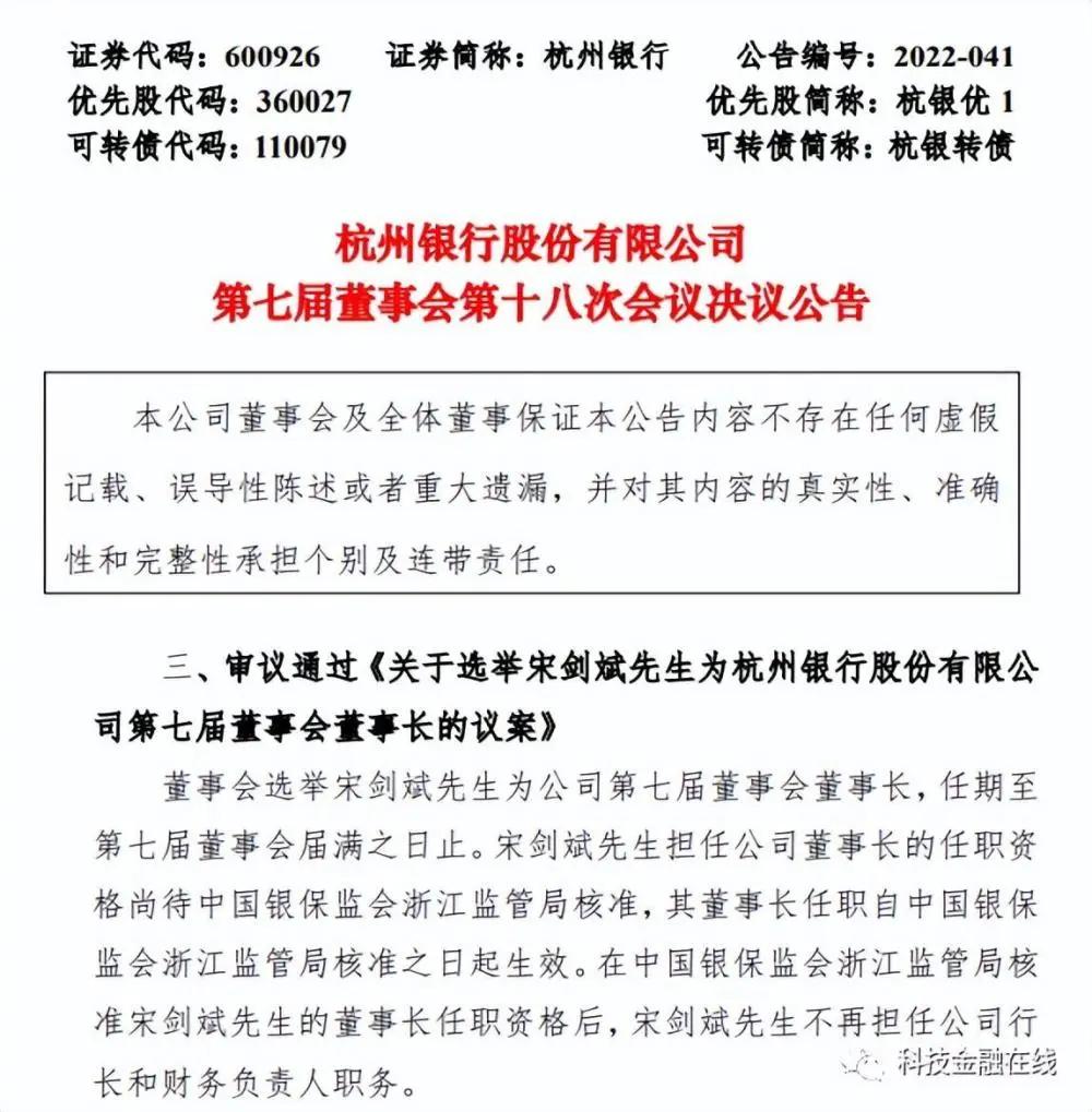 不久前,杭州银行发布公告称,收到《中国银保监会浙江监管局关于宋剑斌任职资格的批复》(浙银保监复[2022]582号),已核准宋剑斌先生的公司董事长任职资格。