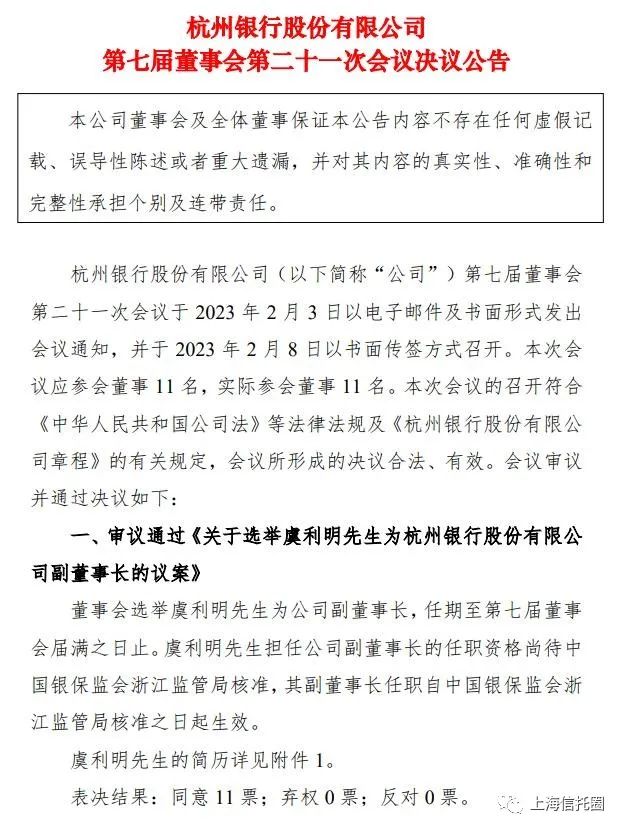 导读:2月8日,杭州银行公告称,董事会审议通过《关于选举虞利明先生为杭州银行股份有限公司副董事长的议案》,虞利明还兼任杭州工商信托党委书记、董事长等职务。