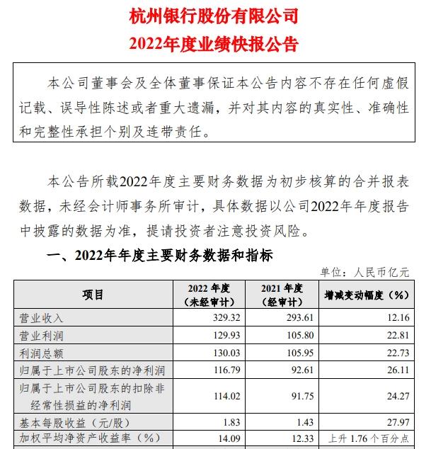 2月14日,杭州银行发布2022年度业绩快报,该行实现全年营业收入329.32亿元,较上年同期增长12.16%;实现归属于上市公司股东的净利润116.79亿元,较上年同期增长26.11%。