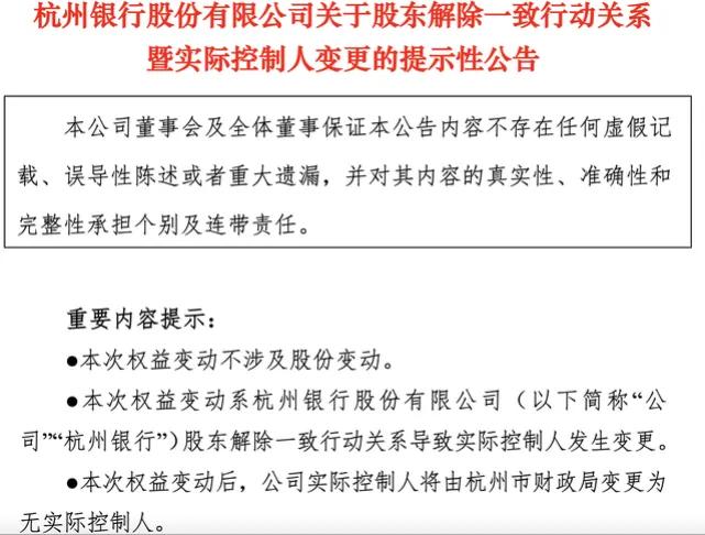2月12日晚,杭州银行发布实控人变更公告称,杭州市财政局、杭州市财开投资集团有限公司等8家股东于2月8日分别签署了《关于杭州银行股东解除一致行动关系的声明书》,确认解除各方一致行动关系,解除一致行动关系后,杭州市财政局也不再是杭州银行实际控制人,杭州银行变为无实控人状态。