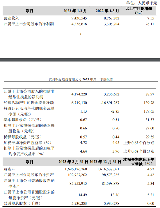 4月27日消息,杭州银行披露一季报,一季度实现营业收入94.31亿元,同比增长7.55%;净利润42.39亿元,同比增长28.11%;基本每股收益0.67元。一季度末,公司不良贷款率0.76%,较上年末下降0.01个百分点;逾期贷款与不良贷款比例71.54%,逾期90天以上贷款与不良贷款比例52.20%。