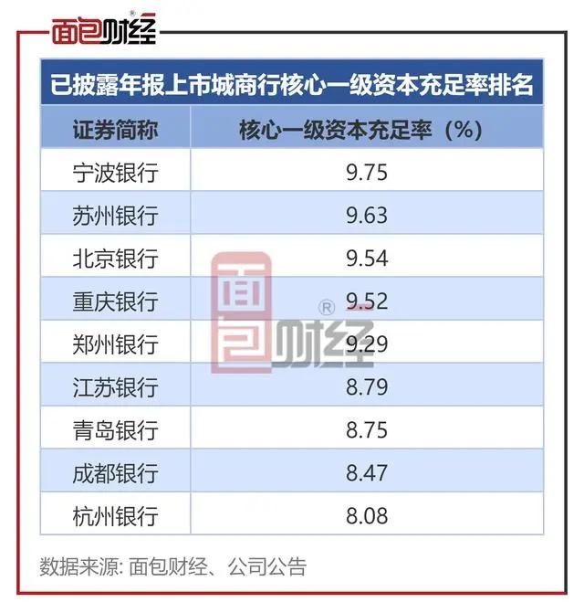 数据显示,近两年,杭州银行的资本充足率相关指标均呈现下降趋势,核心一级资本充足率从2020年的8.53%下降至2022年的8.08%,接近7.5%的监管标准。与9家已披露2022年年报的上市城商行相比,杭州银行的核心一级资本充足率排名末位。