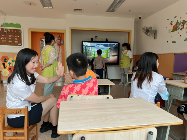 活动现场,青年员工各自组队分往不同班级,与孩子们积极互动,协助老师开展教学,用爱心陪伴孩子们度过一段欢乐时光。