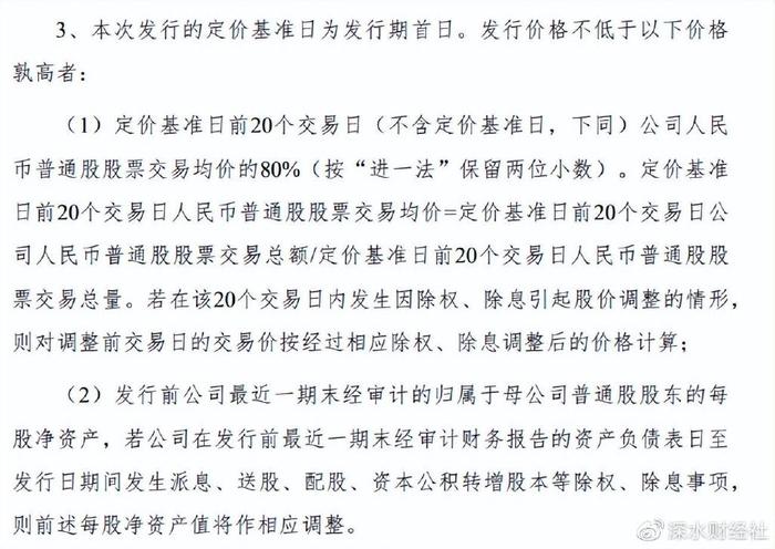 根据公告,本次定增发行价格不低于以下价格孰高者:一是定价基准日前20个交易日交易均价的80%;二是发行前公司最近一期末经审计的归属于母公司普通股股东的每股净资产。定价基准日为发行期首日。