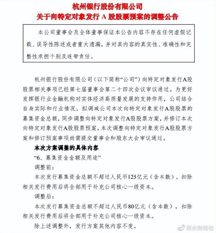然而仅仅过了一晚,定增预案就被修改。6月27日早上,杭州银行又发布公告,把募资总额从125亿下调到80亿,整整缩水了40亿。