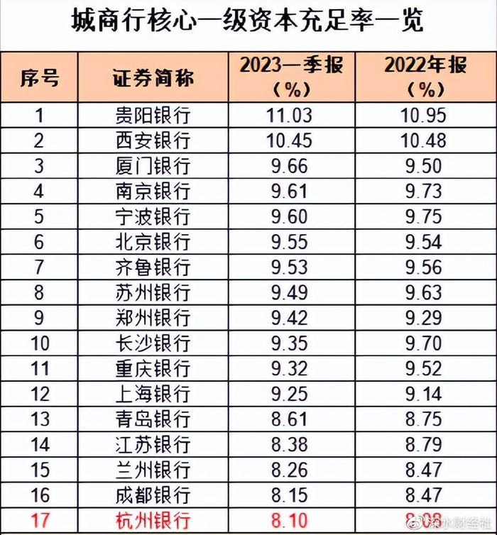 截至今年一季度末,杭州银行核心一级资本充足率8.10%,一级资本充足率9.71%,资本充足率12.74%。尽管核心一级资本充足率较上年年末上涨了0.02%,但杭州银行资本充足率水平依然排在上市城商行末位。