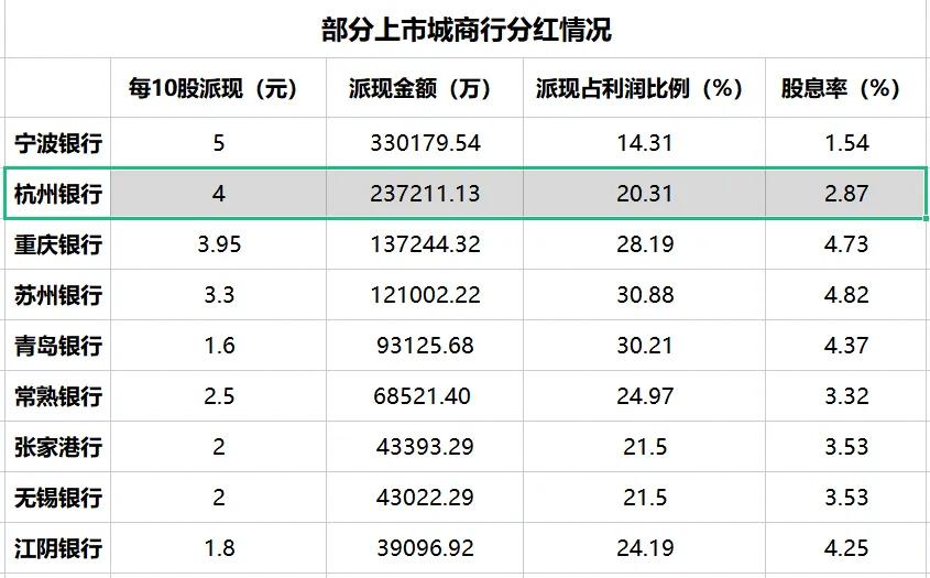城商行中,杭州银行4月25日发布的2022年度分配预案则显示,其拟10派4元(含税),预计派现金额合计为23.72亿元。派现额占净利润比例为20.31%,以该股2022年度成交均价计算,股息率为2.87%。