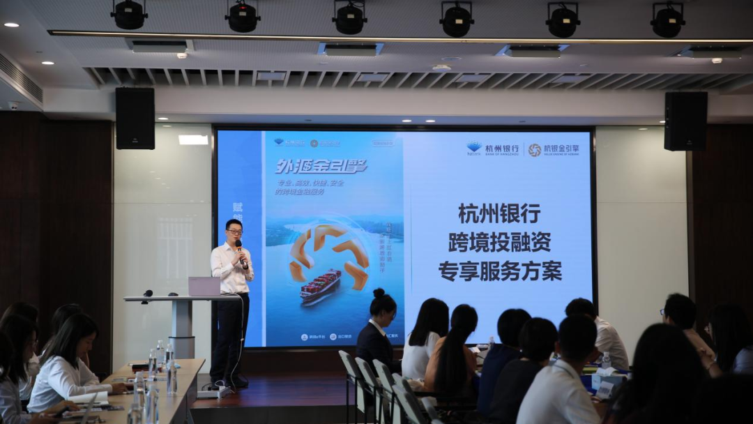 △杭州银行交易银行部跨境金融部负责人颜陈胤向与会企业介绍跨境投融资专享产品服务体系