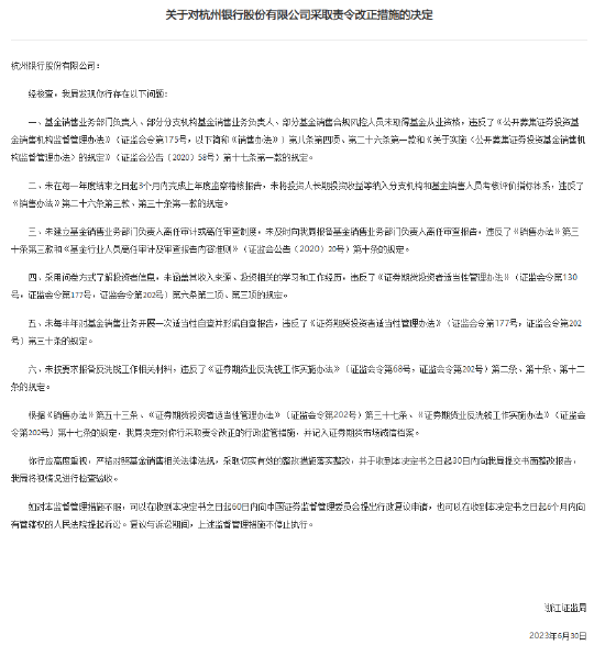 7月21日金融一线消息,浙江证监局发布公告显示,杭州银行股份有限公司因存在多类问题,被处以责令改正,并记入证券期货市场诚信档案。