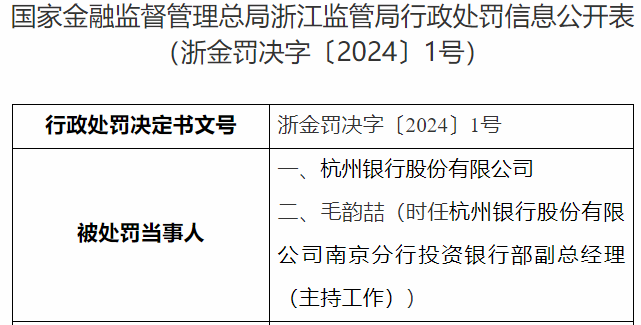 对上述违法违规行为,国家金融监督管理总局浙江监管局决定对杭州银行罚款210万元,对时任杭州银行股份有限公司南京分行投资银行部副总经理(主持工作)毛韵喆予以警告。