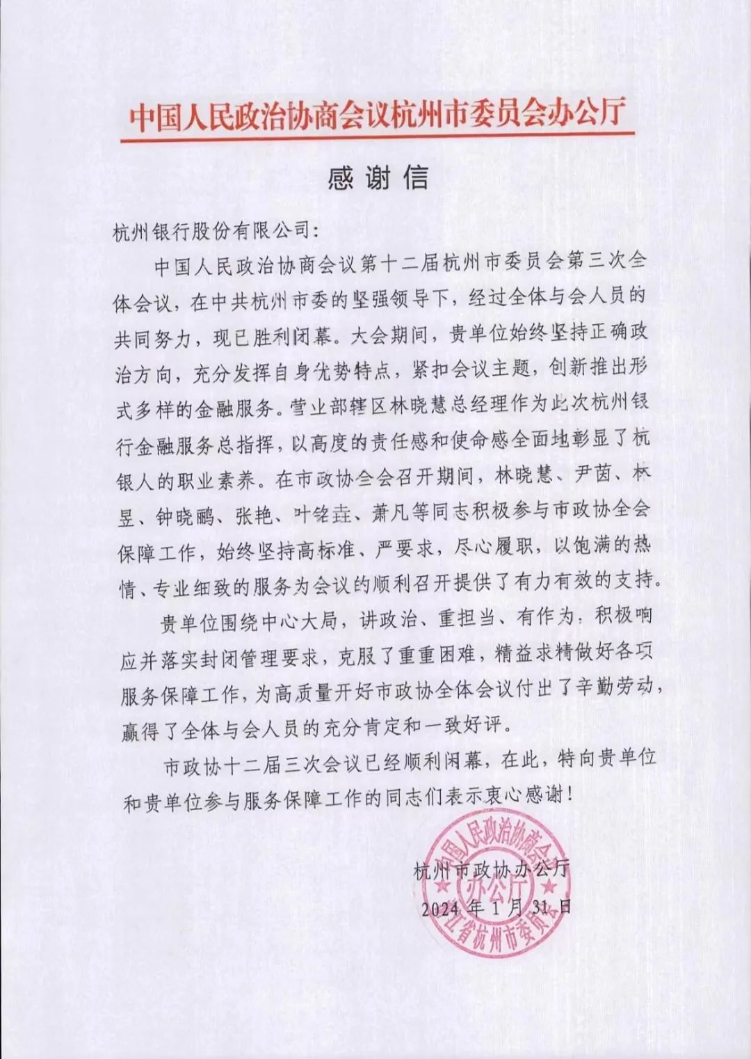 作为本土法人银行、杭州人自己的银行,杭州银行将始终坚守金融为民的初心、践行金融惠企的职责使命,持续为市民提供优质、便捷的金融服务,围绕做好“五篇大文章”,聚焦三个“一号工程"提升金融服务质效,用实干交出”勇攀高峰、勇立潮头”的金融新答卷。