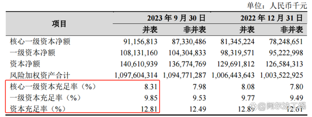 财报数据显示,截止2023年三季度末,杭州银行的资本充足率、一级资本充足率以及核心一级资本充足率分别为12.81%、9.85%以及8.31%。