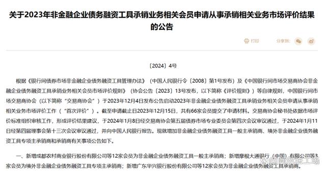 值得一提的是,据交易商协会公告,此次市场评价工作于去年12月启动,评价对象包括非金融企业债务融资工具承销类会员和意向承销类会员。申请期内共有66家会员提交了申请材料,最终新增27家承销商。