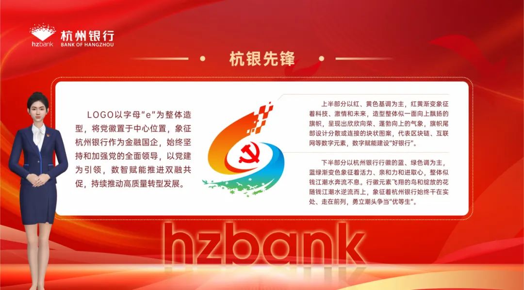 年初以来,紧扣“深化改革、强基固本”主题主线,我行发挥科技力量,升级打造杭州银行数智党建系统,为全行300余个党组织、5000余名党员标准化、规范化、精细化管理提供了数字化解决方案。在此基础上,配套设计“杭银先锋”党建logo,同步开发党建数智人——杭小美,进一步提升数智党建的系统完整性和品牌影响力。
