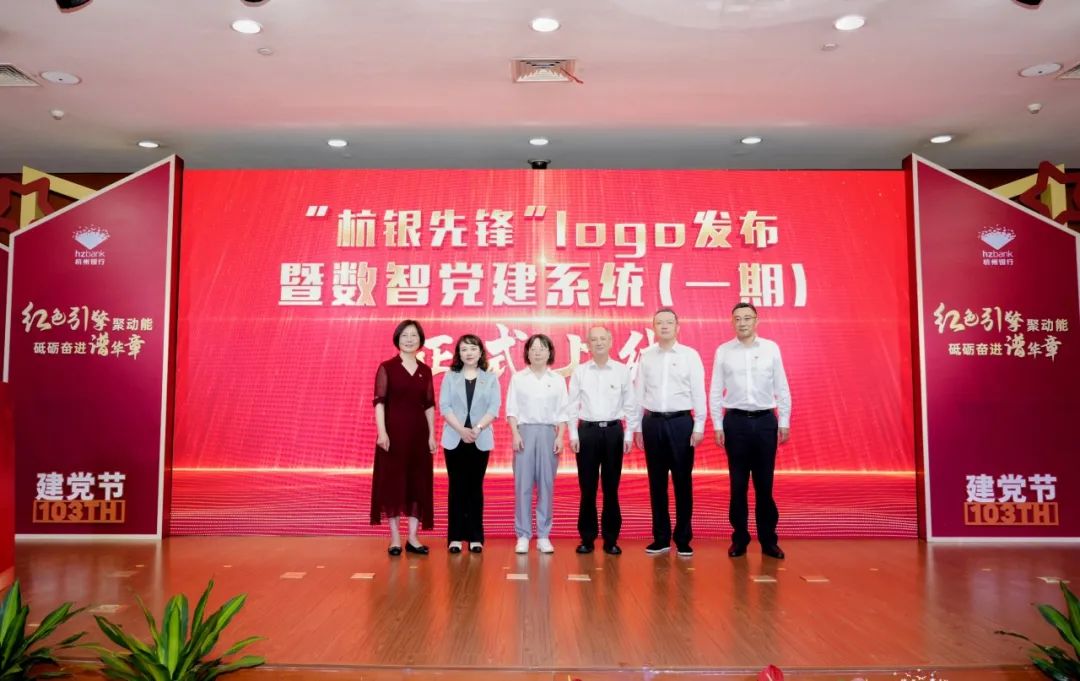 活动现场,浙江省银行业协会副秘书长傅利珍,市委金融办、机关党总支委员、地方金融监管处处长朱茜,市国资委党建工作处处长黄蔚娜,行党委书记、董事长宋剑斌,行党委副书记、行长虞利明,行党委副书记温洪亮共同助力“杭银先锋”logo发布和数智党建系统(一期)上线。