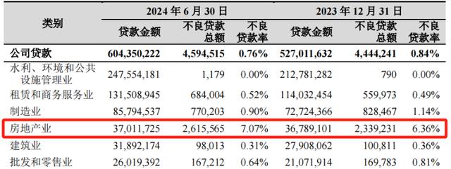 但分行业看,占贷款总额4.11%的房地产业务,不良率高达7.07%,比2023年末再度提升0.71个百分点,在不良贷款总额中占比为38.18%。