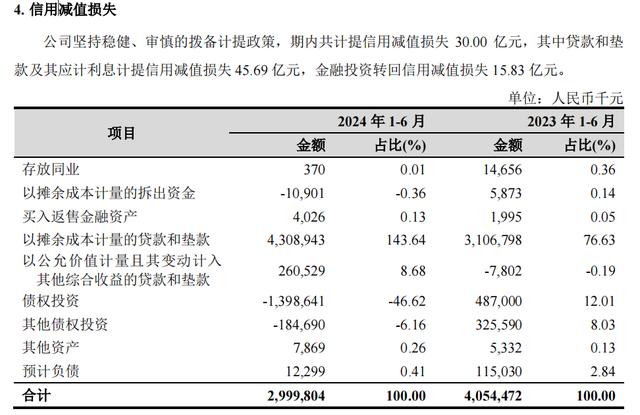 2024年上半年,杭州银行信用减值损失为30亿元,相较2023年上半年的40.54亿元,减少10.54亿元。