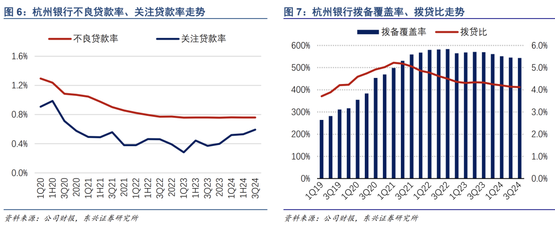 9月末,杭州银行不良率为0.76%,环比持平;关注率0.59%,环比上升6bp,不良+关注贷款占比绝对水平保持低位。拨备覆盖率543.3%(1H24位列上市银行首位),环比下降1.9pct;拨贷比4.12%,环比提高1bp,拨备安全垫厚实,风险抵补能力较强。回顾6月末细分贷款不良率情况,主要风险压力来自对公房地产行业、以及零售端消费贷和经营贷。其中,零售不良阶段性上行与行业趋势相当、且绝对水平较低,有望伴随经济复苏而改善。在本轮推动房地产市场“止跌企稳”的政策加码下,对公房地产贷款资产质量预期有望逐步改善。