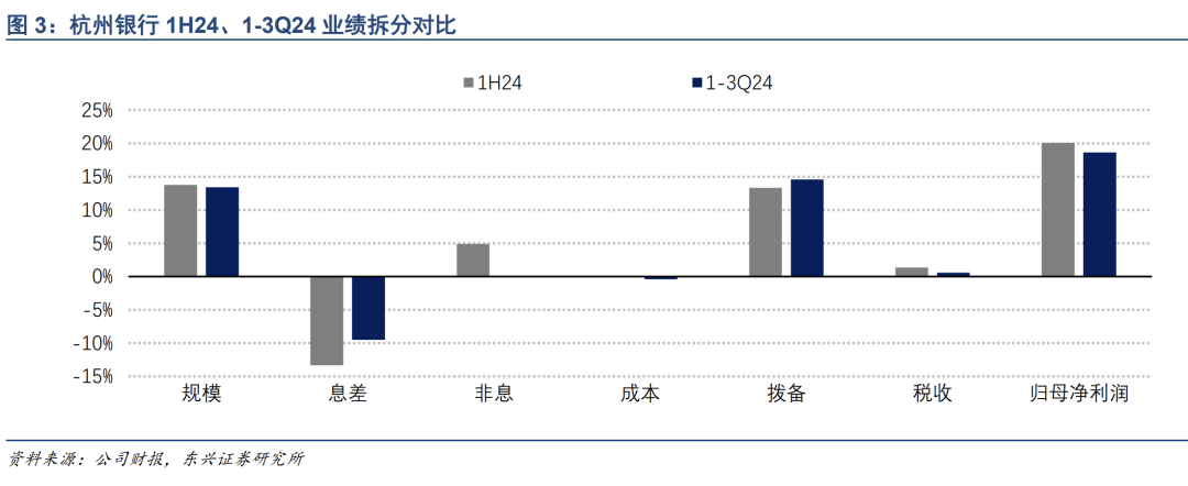 杭州银行前三季度营收、归母净利润同比分别增长3.9%、18.6%,增速较上半年分别-1.5pct、-1.4pct。从盈利拆分来看,规模和拨备释放是主要正向贡献,息差是主要拖累项。其中,①边际贡献增强:息差负向拖累环比减弱,拨备反哺力度增强;②边际贡献减弱:规模正向拉动作用环比小幅下降,非息正向贡献环比减弱。