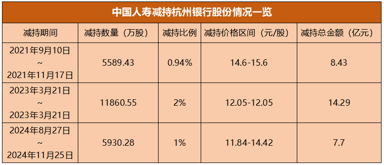 2021年11月,中国人寿在二级市场减持杭州银行0.94%的股份,减持总金额为8.43亿元。