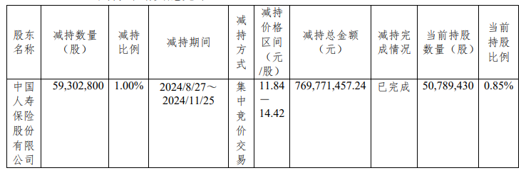 截至2024年11月25日,中国人寿通过集中竞价方式减持杭州银行股份5930.28万股,占公司普通股总股本的1%,减持总金额7.7亿元。截至目前,中国人寿还持有杭州银行股份5078.94万股,占比约0.85%。