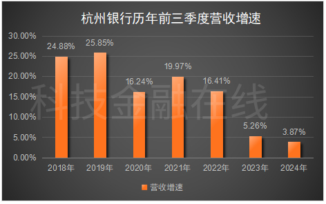 不过,最近杭州银行营收增速也显得乏力。前三季度,杭州银行实现营业收入284.94亿元,同比增长10.62亿元,增幅3.87%,创下自2018年以来最低增速。其中,第三季度营收增速仅为0.86%,几乎陷入停滞增长状态。