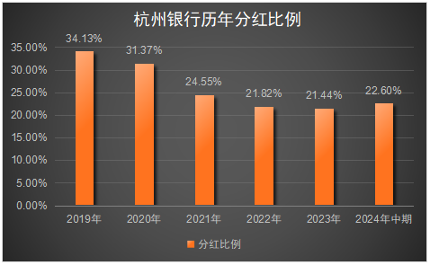 2019年至2024年中期,杭州银行分红比例分别为34.13%、31.37%、24.55%、21.82%、21.44%、22.6%。近两年多,杭州银行现金分红比例维持在21%至23%之间,这一数据在上市银行中并不理想。2023年在宣布分红的41家A股上市银行中,杭州银行排名第33位。