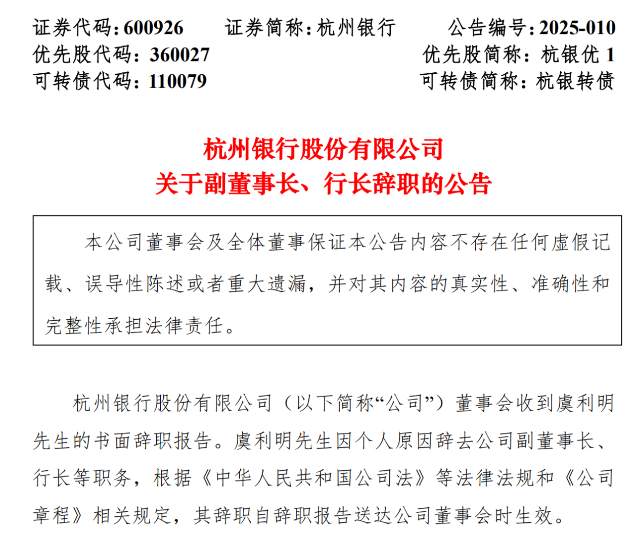日前,杭州银行发布公告称,董事会收到虞利明的书面辞职报告。虞利明因个人原因辞去该行副董事长、行长等职务。