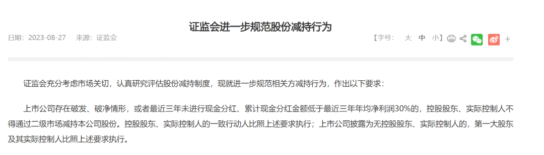 证监会亦明确,上市公司最近三年未进行现金分红、累计现金分红金额低于最近三年年均净利润的30%,其控股股东、实际控制人不得通过二级市场减持本公司股份。