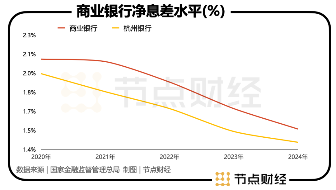 根据国家金融监管总局的数据,2024年,商业银行净息差为1.52%,同比减少0.16个百分点。对比之下,杭州银行的净息差落后于行业平均水平,但降幅却“跑赢”大盘。