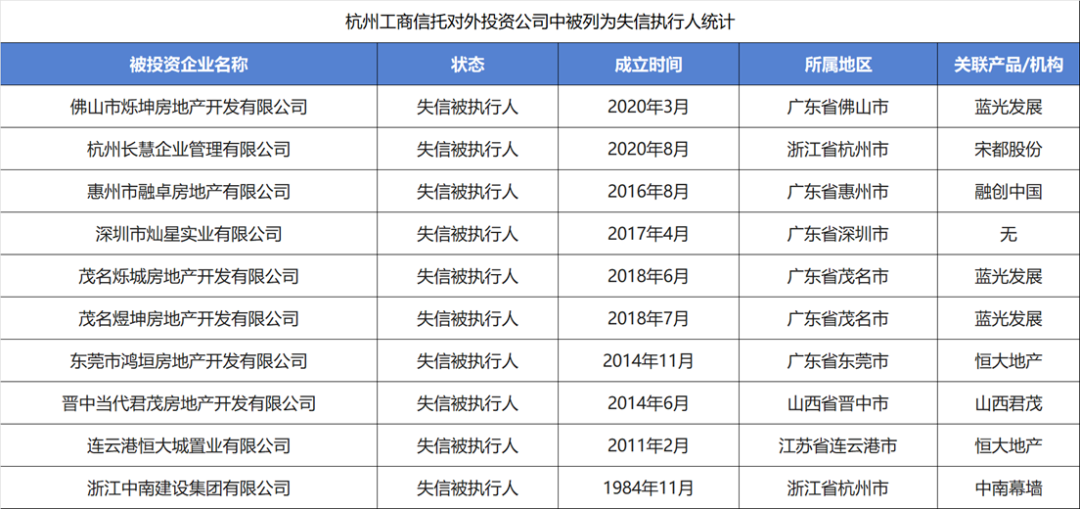 公开信息显示,近几年,杭州工商信托在近十个信托投资项目的合作方被列为失信被执行人,其中包括蓝光发展在佛山、茂名的合作项目,与宋都股份在杭州的项目,与融创在惠州的项目,与恒大地产在东莞和连云港的项目,与山西君茂的合作项目等。虽然公开信息有限,但从这些公司失信时间看,杭州工商信托大概率没有退出其中的投资,其中潜在违约风险到底有多少?