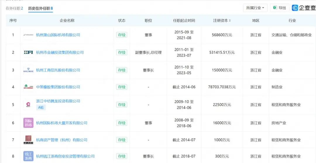 公开信息显示,2018年虞利明任杭州金投总经理,2022年后离任。另外,虞利明2011年10月开始担任杭州工商信托法定代表人、董事长,直到2023年5月离开。虞利明担任的职务还包括杭州萧山国际机场董事(2015-2021年8月),中策橡胶董事(截至2014年6月),这应当是代表投资方杭州金投任职,中策橡胶今年2月在上交所主板过会。