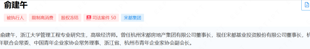 同样,宁波奉化源祺企业管理有限公司背后的杭州宋都房地产集团有限公司以及宋都基业投资股份有限公司也都成了失信被执行人,曾担任杭州宋都房地产集团有限公司董事长、杭州市政协委员、十一届人大代表、杭州市青年联合会常委、中国青年企业家协会常务理事、杭州市青年企业家协会副会长的俞建午股权被冻结,沦为被执行人、被法院下发限消令。