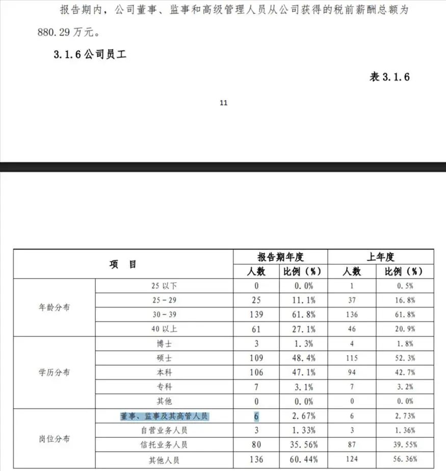 杭州工商信托的员工规模一直保持在190人左右。2023年年报显示,其6名董监高的税前薪酬总额为880万元,人均150万元。但虞利明在任期间的十几年,杭州工商信托年报中并未披露过他本人和其他高管的年薪收入。