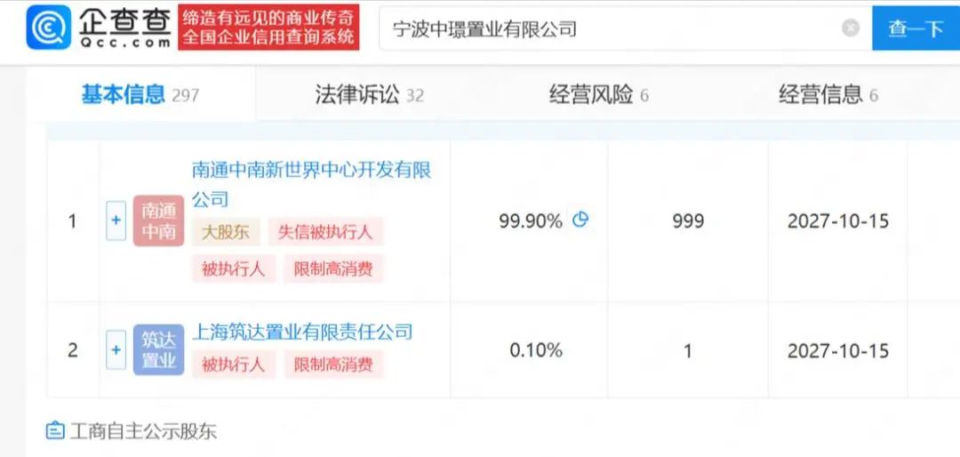 宁波中珲房地产也掉进了同一个坑里,其母公司宁波中璟置业有限公司的俩股东:南通中南新世界中心开发有限公司和上海筑达置业有限责任公司都是被执行人。