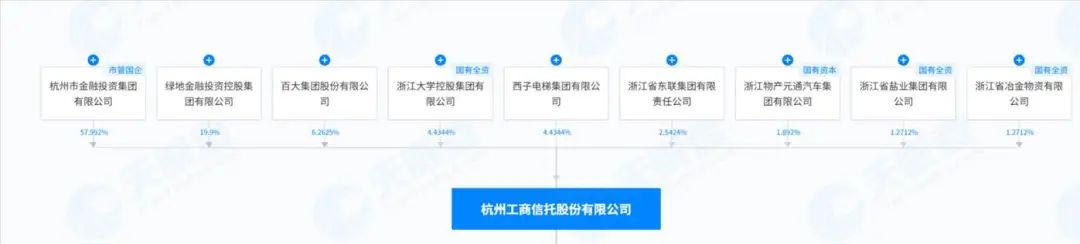杭州工商信托成立于1986年,是杭州市首家股份制金融企业,一共有9位股东,其中,大股东杭州金投持股57.99%,第二大股东为绿地集团旗下的绿地金融,持股19.9%。