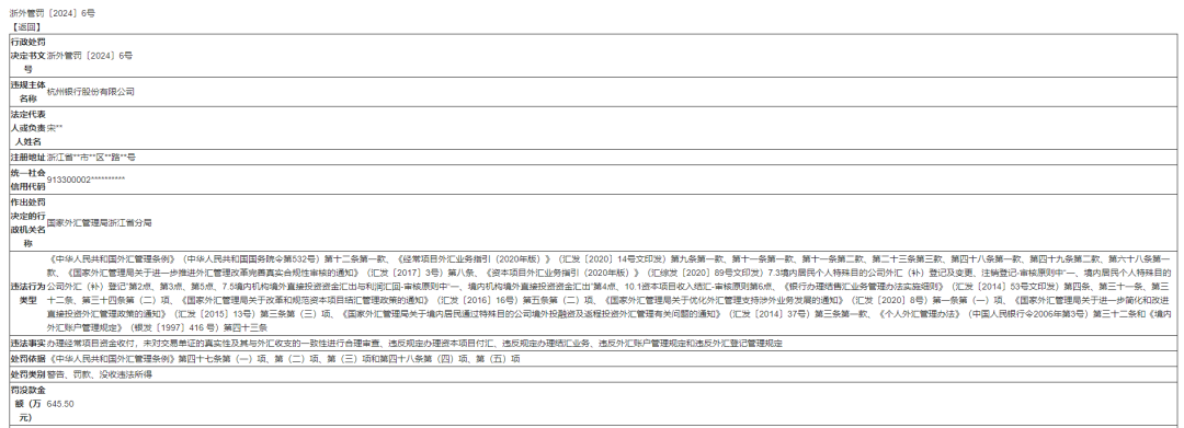 如2024年11月,因办理经常项目资金收付,未对交易单证的真实性及其与外汇收支的一致性进行合理审查、违反规定办理资本项目付汇、违反规定办理结汇业务、违反外汇账户管理规定和违反外汇登记管理规定,杭州银行被罚645.50万元。