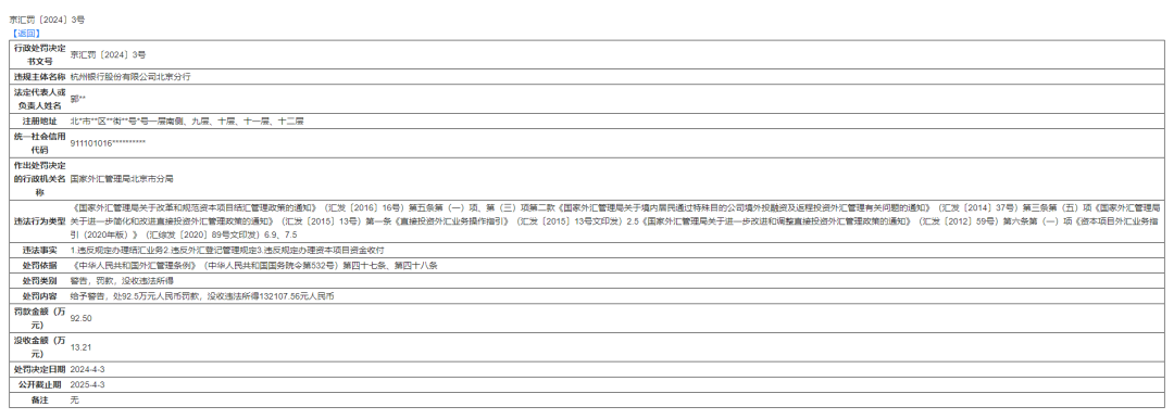 4月,因违反规定办理结汇业务、违反外汇登记管理规定、违反规定办理资本项目资金收付,杭州银行北京分行被罚105.71万元。