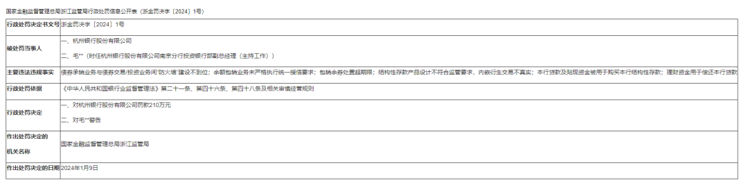 1月,因债券承销业务与债券交易/投资业务间“防火墙”建设不到位;余额包销业务未严格执行统一授信要求;包销余券处置超期限;结构性存款产品设计不符合监管要求,内嵌衍生交易不真实;本行贷款及贴现资金被用于购买本行结构性存款;理财资金用于偿还本行贷款,杭州银行被罚210万元。