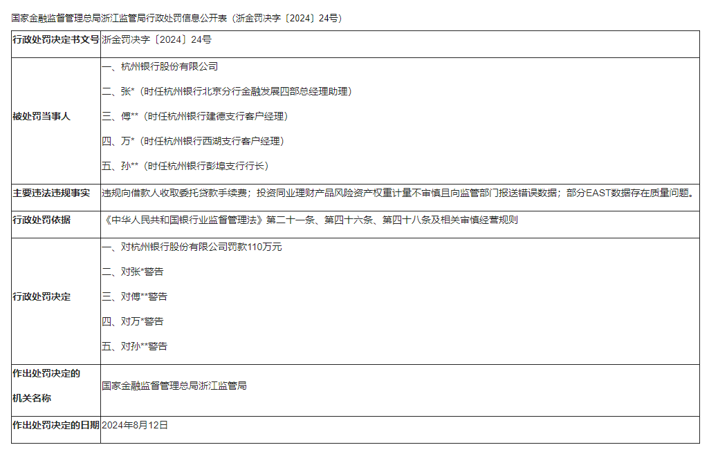 8月,因违规向借款人收取委托贷款手续费;投资同业理财产品风险资产权重计量不审慎且向监管部门报送错误数据;部分EAST数据存在质量问题,杭州银行被罚110万元。