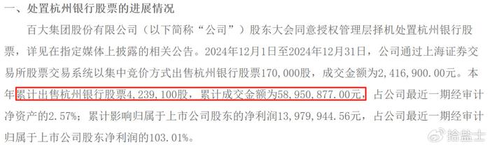 2025年1月3日,百大集团公布处置杭州银行股票的进展,2024年累计出售杭州银行股票423.91万股,累计成交金额为5895.0877万元;同年1月5日,浙江监管局同意浙江红狮水泥股份有限公司受让红狮控股集团有限公司持有的股份,占股10.89%。