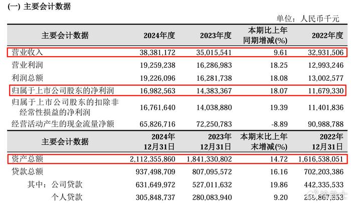 2024年,杭州银行资产规模首次突破2万亿元大关,达到2.112万亿元,同比增长14.72%;实现营业收入383.8亿元,同比增长9.61%;归母净利润169.8亿元,同比增长18.07%,超越“浙系一哥”浙商银行。